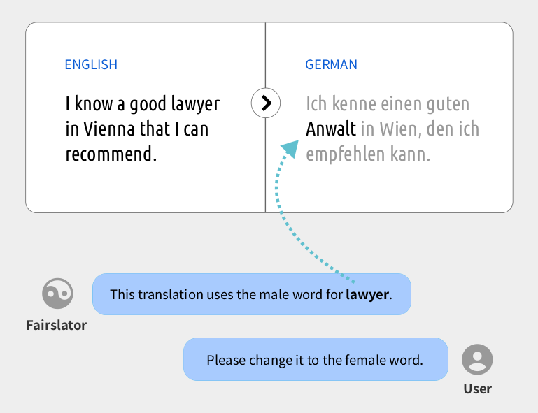 In this example we have an English sentence which has been machine-translated into German. The source text contains the word lawyer which has been translated into German as Anwalt. Anwalt is the masculine word for lawyer, which means that the translation is biased in favour of the male reading of lawyer. What should we do if the lawyer we are talking about is actually a woman? We ask Fairslator to rewrite the translation from male to female, of course!