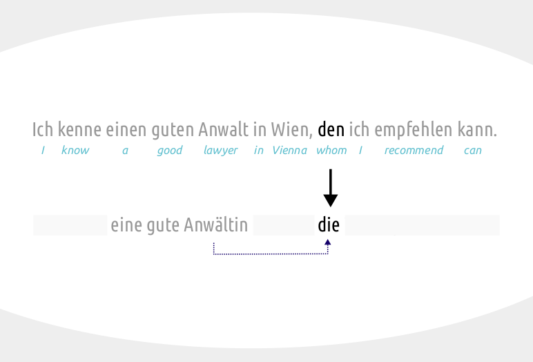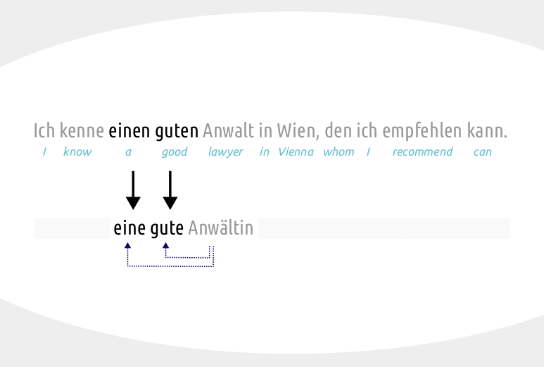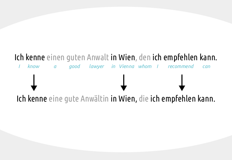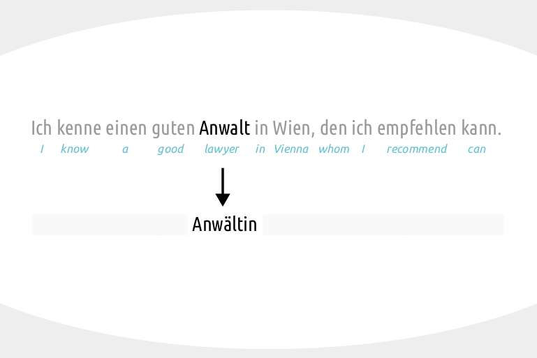 The first step is to change the masculine word Anwalt to the feminine word Anwältin. Fairslator looks the word up in its database of gender-paired nouns. Most such words are occupation terms, like in this example.