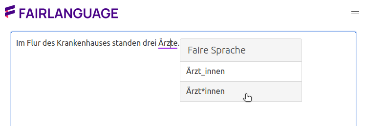 Im Internet gibt es zahlreiche Wörterbücher und Tools, die man benutzen kann, um Wörter in einem Text durch geschlechterneutrale Alternativen zu ersetzen: Ärzte durch Ärzt*innen, Studenten durch Studierende und so weiter. Ein Beispiel ist diese App von Fairlanguage.