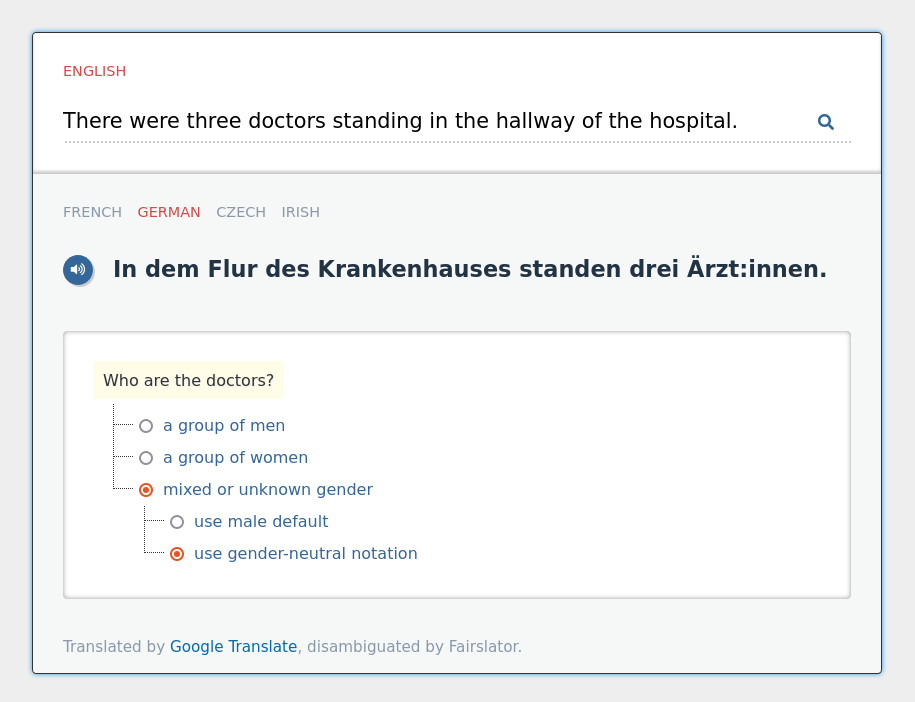 Eigentlich wollte ich diesen Artikel als eine Art Entschuldigung schreiben. Eine Entschuldigung dafür, wie robotisch und einfallsarm meine App Fairslator beim Übersetzen den Genderdoppelpunkt einsetzt. Fairslator ist ja nur eine Maschine. Sie als Menschen können sich bestimmt etwas Besseres einfallen lassen!